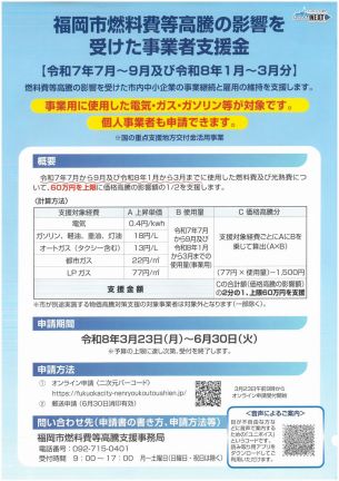 | 福岡市燃料費高騰の影響を受けた事業者支援金 令和7年7月~9月及び令和8年1月~3月分 |